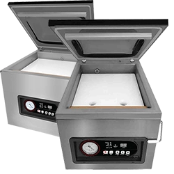 Double chamber vacuum sealers, also often referred to as dual chamber vacuum sealers, as the name implies are like two machines in one housing. Some dual units feature two lids and two entirely separate vacuum cavities. However, the most common type of double chamber machines are the swing lid units. These machines feature either two separate vacuum cavity areas or one large flat working deck and one lid that is swung back and forth between the vacuum working spaces. This design offers the most efficient production throughput as it minimizes downtime by keeping operators busy unloading and reloading one side of the vacuum workspace while the machine is cycling the other side. This high throughput capability is a very important part of why the double chamber models have become known as the “workhorse” of vacuum chamber sealer models. When this is combined with high quality construction and high quality, high performance vacuum pumps you have an industrial machine that is ready for high volume vacuum sealing operations and extra heavy use (two 8 hour shifts per day). So whether your product is a food related, an electronic related product needing to be dry-packed or anything in between a double/dual chamber vacuum sealer will get the job done and increase your productivity.